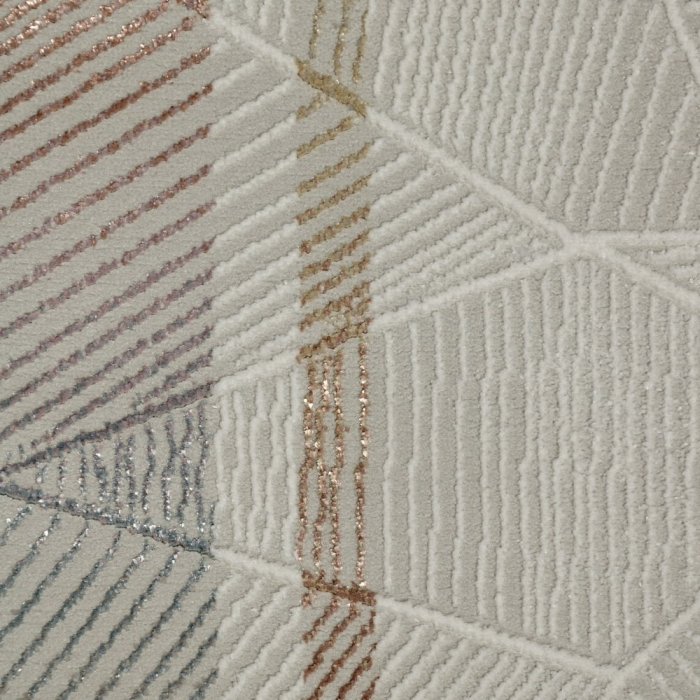 Kusové koberce Rebeca vsází na geometrické jemné vzory. Na první pohled každému padne do oka pololesklá nit,která na světle se třpytí. Vždy krémový podklad a jemné barevné pruhy vynikají a dotváří zajímavý efekt a v prostoru vynikne daleko víc.